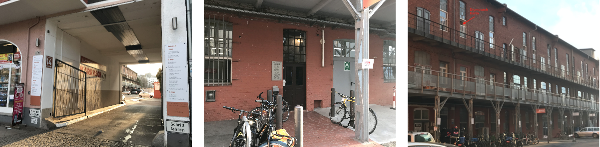 Bitte gehen Sie im Gewerbehof der Schwedenstrasse 14 zum Fabrikgebäude linker Hand und dort den 1. Aufgang hoch in den 1. bzw. 2. Stock.